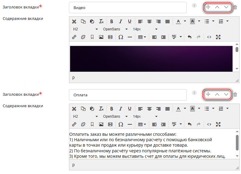 Если Вам требуется изменить порядок ранее созданных вкладок, то кликните по функциям вверх\вниз, либо перетащите вкладку нажав на соответсвующий значок.