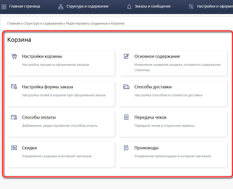 На странице редактирования параметров корзины вам будет доступно: