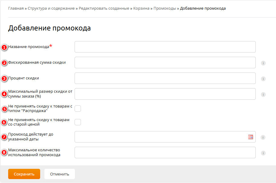 - Задать максимальный размер скидки от суммы заказа в % (процент от суммы заказа, ограничевающий размер скидки по промокоду)
